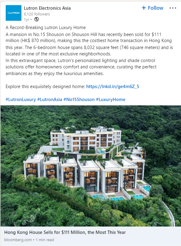 - Copywrote LinkedIn posts documenting their latest residential projects in Hong Kong and China.